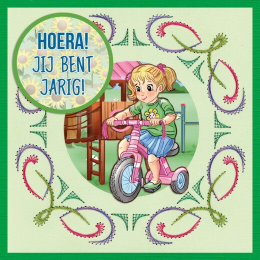 Met borduurwerk op donker karton geef je een andere dimensie aan je zelfgemaakte kaarten. Elke set bestaat uit vier basiskaarten, vier voorgeprikte patroonkaarten, vier 3D-afbeeldingen en 4 kleuren x 25 m Stitch and Do borduurgaren.